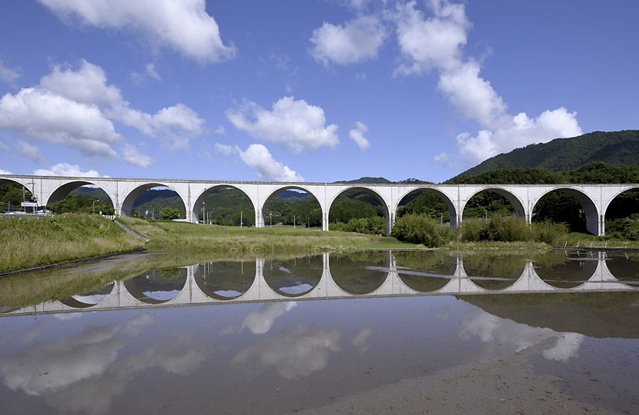 昨日取り上げたクジャクサボテンの花は、昨日の昼にはグタッ~と萎れていました。僅か1日の儚い命でした。という風な話は関係ありませんが・・・・ 1週間前に取り上げた眼鏡橋、播但連絡道路の虎臥城大橋にもう一度、ということで出掛けました。一昨日(日曜)のことです。この日も自宅を出る頃は雲は探しても見当たらないような好天でした。2時間少々車を駆って現地に到着した頃には、この日もいくらか雲が出ていました。内陸部ゆえ雲が出易いのか、はたまた2時間の経時変化で雲が広がったのかはっきりしませんが、撮影に支障が出るような曇天ではありません。 前回、この田圃で撮りたい!!と思っていた田圃はきれいに掻き均されて、水も張られていました。惜しむらくは水位が低く、ところどころ泥が露出していました。それでも何とかベターな位置を探して撮影した結果が上の画像です。やはり眼鏡には青空が似合う(!?)ようです。ということで、今年は間もなく梅雨に入り晴れ間も望み難いということで、今年の眼鏡橋探訪は今回で幕とします。