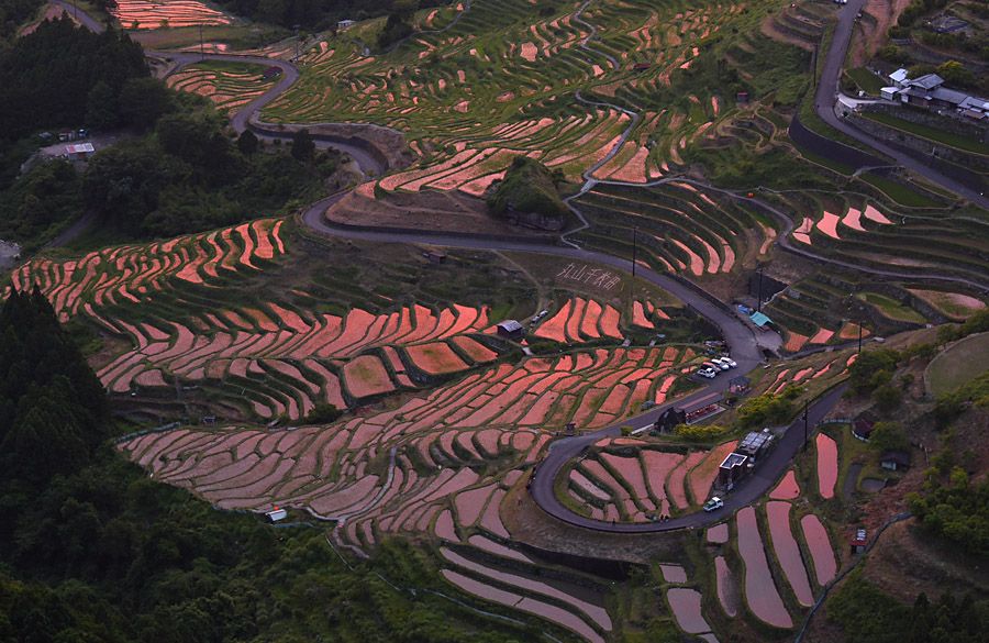 これまで三重県の丸山千枚田には何度か遠征しましたが、日中、それもかなり日が高い時間帯が多かった様に思います。夕焼けの時間に合わせて行ったこともありましたが、その時は全く空が焼けなくて空振りに終わってしまいました。何とか夕焼けに染まる棚田の情景をカメラに収めたいと思い続けていましたが、棚田の水面が表に出る期間が極めて短いことや、その時期が梅雨入りの時期と重なるため、夕焼けの確率も低い・・・といった事情でこれまで実現できずにいました。 今回の遠征ではこうした諸々の不確定要素が全て上手く転がったことや、天候の幸運な巡り合わせがあって、やっと念願の画像をゲットすることができました。最大の幸運は梅雨前線が南の海上に後退して、束の間の晴れ間が現れたことですが、これだけでは十分な夕焼けは実現しません。この前線の雲に代わって列島上空に忍び寄ったのが高層の雲でした。薄い雲を透かして青空が見られるような空模様でしたが、この高層の雲が実にいい仕事をしてくれました。 現地の日没時刻(19:09)になっても、西の空は部分的に赤くなるものの広がりがなく、棚田の水面は白けたままでした。日没から5分ほど経過した頃、高層の薄い雲が赤く染まり始め、その範囲は仰角45度付近まで広がりました。この赤みが田圃に反射したことで、長年の思いがやっと叶いました。この時点の明るさは風景撮影には甚だ不向きな”暗さ”でした。この点は増感現像で明るさを実態以上に明るく補正しています。尚、画像をクリックすれば一回り大きいサイズでご覧戴けます。