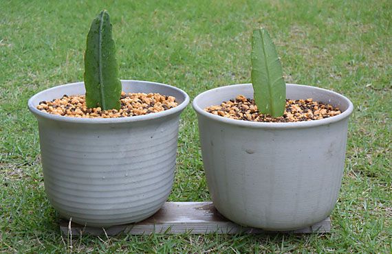 半月前、クジャクサボテンを挿し芽目的で切り出し、屋内で陰干ししていました。サボテンの状態がどの様になればOKか・・・という明確な基準を承知している訳ではありませんが、ごくアバウトに「この辺で良かろう」ということで、植え付けることにしました。 用意したポットは6号プラ鉢です。サボテン用には専用の用土も売られていますが、我が家では普通の園芸用土を配合して使います。それがサボテンにいいか悪いかは、余り考えていません。ということで中粒、小粒の鹿沼土と赤玉土を、ほぼ同量配合した用土で植え付けたのが上の画像です。過去の経験では、適度に潅水していれば100%定着します。定着すれば、この幹(葉?)のトゲの位置から新芽が出てきます。1品種で2鉢は要らないので、元気な枝ぶりの個体を選抜することになります。花が咲くようになるのは早くても2年後になるかと思います。今回はジャングル化を回避するために、花付きに関係のない芽は除去してしまおうと思っています。