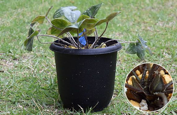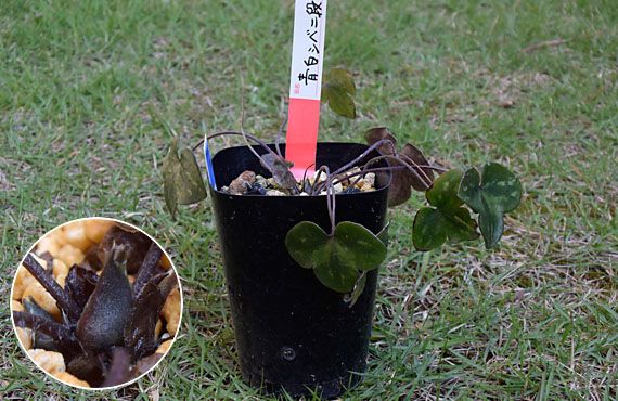 今頃何という暴挙・・・とお叱りを頂戴するかもしれませんが、3月にリクルートしてそのままになっていた雪割草を植え替えることにしました。この品は特段の銘はありませんが、青い花弁に白いシベが映える美麗な品種です。植え替え実行がこの時期までずれ込んだのは、適期に入院というアクシデントに見舞われたことが最大の理由です。ずるずると梅雨のこの時期まで伸びたのは、植え替え後、新しい環境に馴染むまでの期間、高温や乾燥といったストレスがいくらか軽減するだろうという期待もあります。 株は既に来年の春に向けて花芽の準備に取り掛かっていました。今の大きさは大豆粒大といったところで、2個が育っていました(円内)。用意した新居は4号陶鉢です。これを雪割草専用土を真似た自家配合用土で植え付けます。根回りに用土の隙間が生じない様、慎重に充填して作業は終了です。期待していた雨はどこかで迷子になっている模様なので、それがやって来るまでは屋内の刺激の少ない環境で新居に馴染むのを待つことにします。