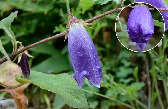 青花ホタルブクロ(蛍袋)が佳境に入りました。花の数は昨年と比べて倍増に迫る勢いがあります。昨年まで一回り小さなポット(6号)に押し込めていたものが、秋の手入れで全面的な植替えを実施し、半数を7号ポットに、残る半分の若齢株を露地に植え替えていました。この植え替えで過密感が軽減したことが、出来高のアップに繋がったものと考えられます。 という様な、いいことばかりではありません。今年の花の顕著な傾向として、円内の画像の様に口を開けないものが実に多く見られました。5月末に1番花の開花を紹介しましたが、その時も花弁の半分は癒着したまま開かず、やむなく開いている側から撮影したものです。こうした不完全開花が7~8割を占めるという惨憺たる成績でした。ここに来てそうした障害から解き放された様に、5弁が完全に開くものが多くなって来ましたが、何が原因でこうした障害が起きたかは不明のままです。美麗な品種だけに、できることなら全点完全な姿で開花して貰いたいものなのですが、打つ手が見つからないのが現実です。