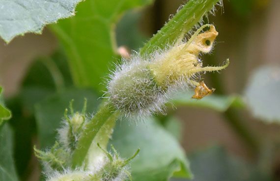 メロン苗を植え付けて1ヶ月半が経過しました。ここに来て蔓の伸び方にも弾みが付いた様で、脇芽を含めて急速に賑わいを見せ始めました。梅雨入り宣言後、すっと晴れ間が続いていましたが、今日辺りやっと雨が降りそうなお告げが出ました。この雨で蔓の伸びも一段と加速するのではないかと思います。 概況はさておいて、これまで雄花ばかりだった花の中に、初めて雌花が混ざり始めました。産毛に包まれた実の部分の大きさは、ぎりぎりグリーンピース大といったところです。初見の日、雌花は2個見つかりました。昆虫類の媒介で既に受粉は済んでいたかもしれませんが、念のため手近かな雄花を採取して、人工授粉も実施してしまいました。数日様子を見て、この毛むくじゃらのグリンピースが大きくなる様なら、無事に受粉したことになるし、立枯れる様ならまた次の機会に・・・ということになります。雨の中になりますが、暫く見回りは欠かせません。