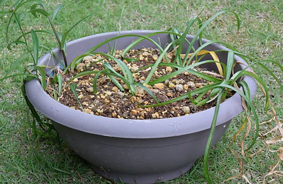 厳寒の1月に手が凍えるのを我慢しながら植え替えを実施した原種ネリネ(Nerine undulata )でしたが、その際分球して大量に発生していた小玉の球根は、”一時的”ということで用土配合に使っていたボールに仮植えしていました。その”一時的”措置がずるずると伸びて半年近くも経ってしまいました。いやはや面目ないことで・・・・ そろそろ定植しないと成長の阻害だけに留まらず、条件によっては枯死してしまいかねません。ということで予め用意していたプランタを取り出しましたが、40cm径の大型とあって用土が足りません。慌ててHCに買いにいくことに・・・。絵に描いたような泥縄になりましたが、調達した用土を常用の比率で配合し、化成肥料も少し多めに配合して植付けを済ませた様子がこちら。分球間もない球根で、その大きさはやや大きめのラッキョウ・・・といったサイズばかりです。花を咲かせるのは2年後くらいになろうかと思いますが、お気に入りのピンク花品でもあり、この半年の手抜きのことは棚に上げて、肥培に努めることにします(いと白々し)。