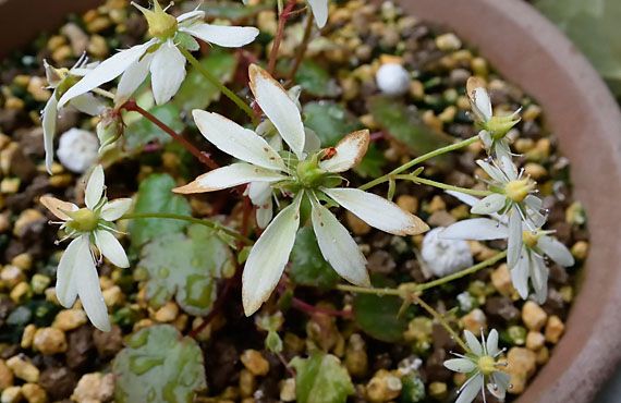 11/28に第2幕として咲いたダイモンジソウの「瀬戸翠」に、店仕舞いの時が近付いています。画像中央の個体はその時開花した1番花ですが、シミ、クスミが全身に回り、生命の限界を物語っています。花弁は開花時点では8枚ありましたが、いつの間にか1枚減ってしまいました。何者かに食われたのか、或いは風で吹き千切られたのか、原因は分からないままですが、いずれにしても長い間よく頑張ってくれました。 現時点でこの様な花弁の褪色が認められるのは、全体の3~4割です。黄変した花弁は自ら散ることはありません。腐敗する花殻を見るのも辛いし、採取する予定もない種子を成熟させるために、余計なエネルギーを消耗させるのも無駄なので、子房の発達した1個か2個を除いて、花殻は摘果することにします。