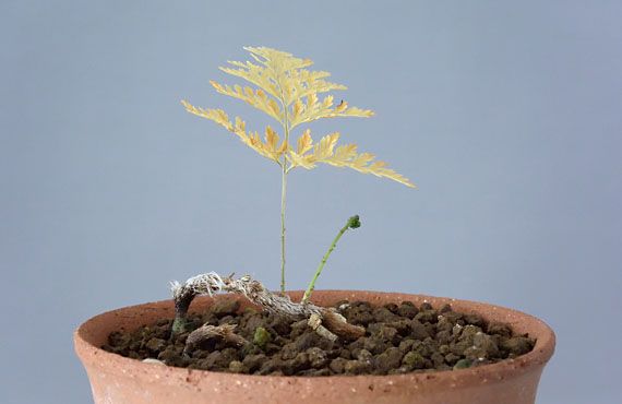 屋内に置いて、何とか通年で葉を残させようと企んでいたシノブの1号鉢が、年の変わり目頃から次第に精彩を欠く様になっていましたが、ここに来てとうとう枯れてしまいました。葉は2枚出ていましたが、先に枯れた1枚は早々と落葉してしまいました。特段の加温もせずに冬越しさせようというのは、少々虫が良過ぎたか、などと反省もしていたのですが、案外そうでもなかったかもしれません。 枯れてしまった葉っぱから1cmほど離れた位置で、年が明けた頃には小さなコブだったものがどんどん成長し、今では2cmほどまで丈が伸びました。ここまで成長すると、葉っぱ以外ではあり得ません。だったら古い葉が枯れたのはなぜか、という点が問題になる訳ですが、これといって思い当たる手抜きはありませんでした。結局、原因はあやふやなままですが、今の環境でも葉が育つことが明らかになった訳で、この新しい葉を夏まで保つことに専念することにします。