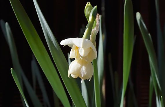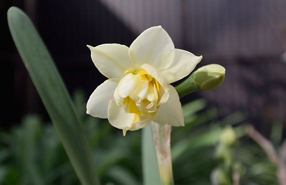 露地植えの八重咲スイセンが開花して20日経ちました。遅れに遅れていたプランタ植えの個体にも、やっと開花の時が巡って来た様です。・・・という風に書き進めると、後を追う様にどんどん咲き進みそうに感じられるかもしれませんが、実は今年のプランタ品はこの花軸1本のみで終りになりそうです。 一昨年の秋、露地植えを撤収して、全てプランタに切り替えてしまいました。理由は露地の豊富な養分を吸収して、やたらと図体が大きくなってしまい、この品種の持つ可愛さや可憐さを感じられなくなってしまったためです。以来、水以外の肥料分は完全に絶って、ひたすらダイエットに努めて来ました。例えば葉の長さですが、露地植えの頃は軽く90cmを超えていましたが、今年は45cmまでスリム化しました。花軸の丈も同様に、90cm越えから今年は40cmまで縮みました。「かなりの成果」と言いたいところですが、最終目標は葉の丈は30cm、花軸の丈25cm以下です。こうした激しいダイエットが花軸の本数に影響していないとも限りませんが、方針を変更する訳にはいきません。「可愛さ、可憐さ」が感じられるまで、この鬼の様な仕打ちは続きます。