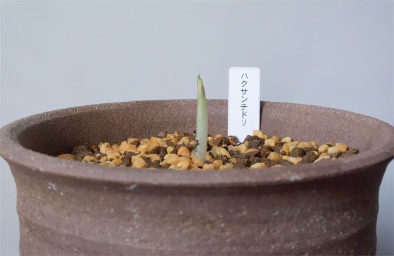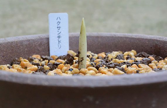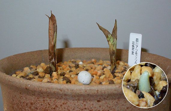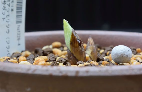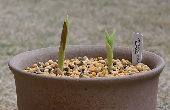 このハクサンチドリ(白山千鳥)も夏の暑さには滅法弱い品種の一つです。で、昨年の猛暑の時期に、地上部が暑さで枯れてしまったのを機に、地下のバルブを根ごと掘り上げてしまいました。それを湿らせたミズゴケに包み、乾燥しない様ジッパー付きポリ袋に入れて15℃程度に設定した冷温機に収容して6月中旬から9月まで過ごさせました。 ここまでは至って順調だったのですが9月某日、その冷温機が機能停止しているのに気付きました。故障して何日経ったか不明のままですが、器内の温度は急上昇し、バルブは芽出しを始めていました。こちらがその時のバルブの様子です。慌てて別の冷蔵庫の設定温度を最高にして、そこに移動しましたが、庫内の温度が10℃以上には上がらず、一旦動き始めたバルブには冷た過ぎたかもしれません。 11月中旬には土壌に植え戻した上で、引き続き冷蔵庫内で過ごさせていました。その頃は始動してしまった新芽は2cmほどでしたが、昨日再確認すると2.5cmに伸びていました(上画像)。この状態で屋外に出すと、速攻凍傷にかかる恐れがあり、それはできません。結局我が家で最も気温が上がらない物置部屋に収容して、芽が動き始めないことを祈る様に、時間が経つのを待っている状態です。 こうした冷蔵夏越し法を総括すると、冷温機の故障というアクシデントで大きく躓いてしまいました。但し、総合的には、気温上昇が激しい我が家では極めて有効な夏越し方法と言えます。今年の夏には、庫内温度上昇時に警報を発する機能を付加するなどして、この方法を広範囲に採用しようと考えています。
