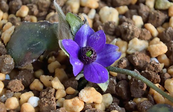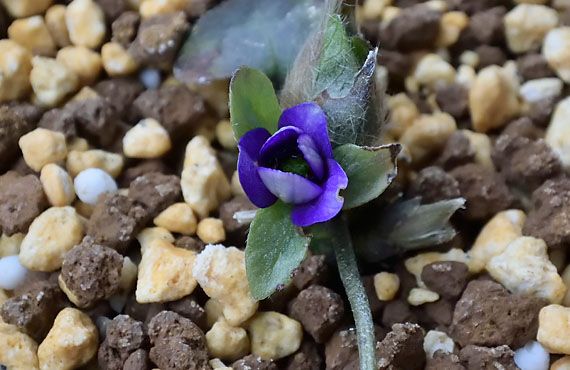 雪割草の2番手「秀麗」が開花しました。”開花”とはいっても花弁が開いただけで、まだシベは固く引き締まったままで、二段咲のこの品種の真価が発揮されるにはもう少し時間が必要です。因みに、今は球形に行儀よく巻き込んでいるシベは、展開すると純白で紫の弁とのコントラストが絶妙です。 1番花は不出来になることが多いのですが、この個体もその通例を受け継いでしまいました。始動が早かった分、賊どもが闊歩している時期に重なったため、ツボミの頭を食われてしまい、その傷が残ってしまいました。弁の長さもまちまちで、整った容姿と言っては嫌味になってしまいそうです。しかし2番花、3番花は未だに分厚いコートの中に納まっており、この中には美形が含まれているに違いありません。