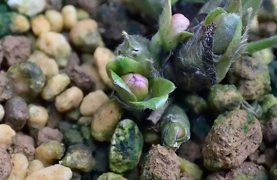 一年で最も寒い時期が近付きつつありますが、それに呼応する様に雪割草のツボミが緩んできました。画像は「秀麗」の銘を持つ二段咲の品種ですが、半開きになった花弁の隙間からシベも覗く様になりました。開花の時期がそう遠くないことを告げている様に見えます・・・と言いたいところですが、最大のファクターである気温の動向と突き合わせると、そんなに単純にコトが進むとも思えません。週間予報を見ても周期的な寒暖を繰り返しそうで、このツボミにしてみれば「行こうか、止めようか」を迷いながら日々を送ることになるかと思います。
