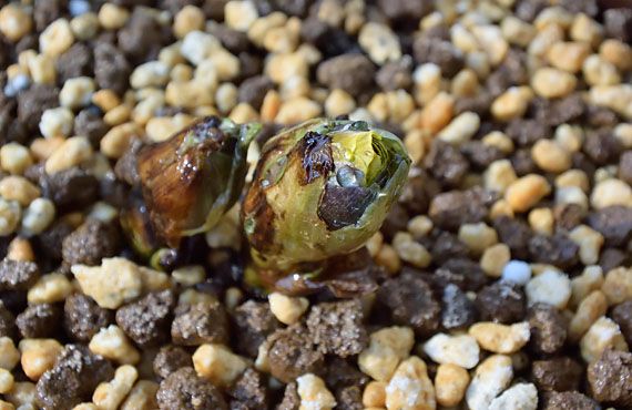 リクルートした時には冬芽はきれいな紡錘形をしていた福寿草の「福寿海」でしたが、この2ヶ月ほどで先膨れに変身していました。常時屋外に置いていたこともあって、冬芽そのものの大きさが変わる様なことはなく、気付かないほどの緩やかな変化でした。 ここに来て冬芽の先端が割れて、花弁の黄色が覗く様になりました。そういえば福寿草ならそろそろ開花してもおかしくない時期です。この品に関する限り、寝惚けとか暴走ではなく、自然な生育プロセスを踏んでいると判定してもいい様です。2月は冒頭からかなり暖かくなりそうな予報が出されており、この期間に大きな変化が起きるかもしれません。