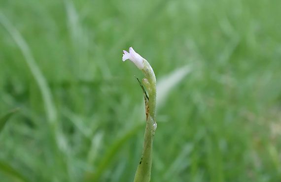 ”開花”などと大口を叩くのもはばかられる出来栄えですが、8日前に取り上げたネジバナがそうなりました。その際予報した通り、花は白花でした。経験上、あと2年、長ければ3年は白花を咲かせる筈ですが、その後は赤花に変化します。尚、昨年と比べて1日遅れですが事実上「有意差なし」としておきます。 この個体は昨年の秋口に、草丈1cmを僅かに超えたものを、芝生の中央部付近(=人の動きが多く、踏み荒らされ易い)から現在地に移植したものです。種子から発芽して僅か2年で花を咲かせたことになる訳で、「あんたは偉い!! 」と褒めてやりたいところですが、何しろ体力不足は否めず、花は1輪だけという寂しさです。カメラの性能上の制約から、ここまでの拡大が限界ですが、3年目の来年はキッチリ捩じった姿を披露できるかと思います。