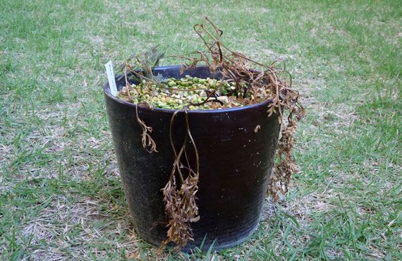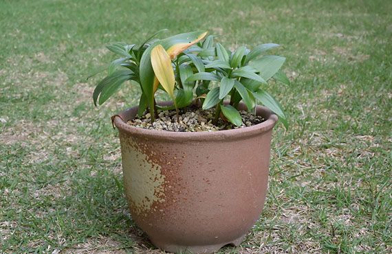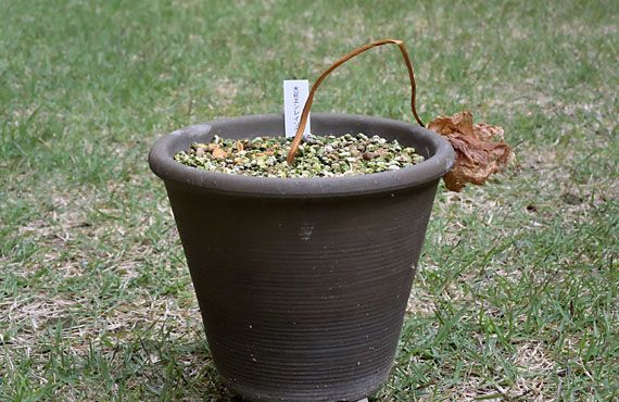 クロユリも休眠に入る準備を始めました。1週間ほどで地上部は完全に姿を消してしまうかと思います。昨シーズンは2株だけだった個体数が、今シーズンは11株に増えていました。”四分五裂”を遥かに超える分裂ぶりです。この結果、どの個体も開花適齢に満たず、今年は花は見られませんでした。 各個体をつぶさに眺めると、1枚葉の個体が半数近くを占めていました。これは球根を構成する鱗片が剥がれ落ち、その鱗片から芽を出したと考えて間違いなさそうです。こうして発生した新生児は、花を付けられる様になるまで数年待ちを覚悟しなくてはいけません。その他の茎を有して、その茎から数枚から10数枚の葉を出した個体でも、いきなり来年花を付けることは期待できそうにありません。暗紫色の独特の光沢を持つ花との再会は2-3年後になるかもしれません。このブランク期間をできるだけ短く収めるためにも、地上部が姿を消すのを待って、植え替えを行い、過密の解消と濃厚な施肥を行ってみようと思います。