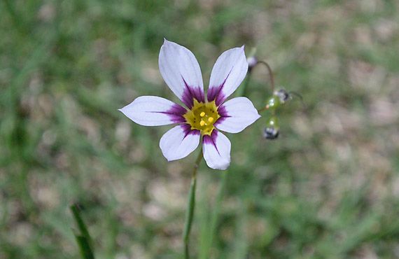 ニワゼキショウ(庭石菖)が開花しました。昨年と比べて6日遅れの開花ですが、遅れた原因は管理人たるワタクシにあり、今年に関しては比較対象から除外することにします。個体は実生3-4年の古参に属するもので、この先相当な量の花を咲かせそうです。 遅れた原因というのは、今月上旬に芝生の雑草抜きを行った際、個体数抑制で唯一残していたこの個体を誤って抜き上げてしまいました。失敗に気が付き、繰り返さぬ様目立つ場所に植え替えたのですが、定着に予想外に手間取ってしまい、この間に葉っぱの大半を失ってしまいました。2週間ほどの停滞だったかと思いますが、この期間が遅れの原因と断定して間違いはなかろうと思います。