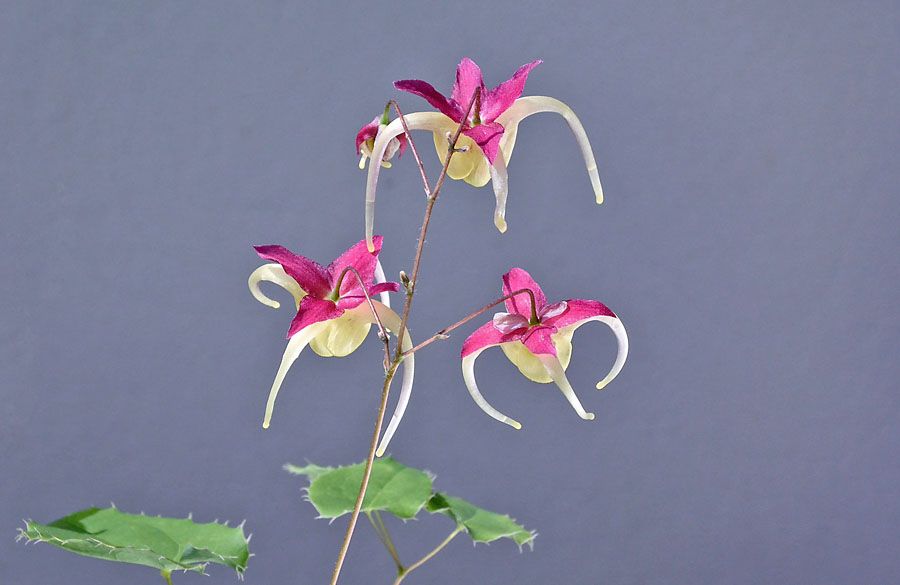 イカリソウの「楊貴妃」が最盛期を迎えました。「不作」だった昨年から、一転して今年は「大豊作」になりました。原因は、昨年の暖冬に煽られて大寒の時期に芽出しを始めてしまった少なくない個体が、寒の戻りで手酷い痛手を負い、花の時期まで引きずってしまったためとワタクシは信じています。 この花の最大の魅力は、深紅の萼弁と淡黄色の距のコントラストだろうと思います。こうした特徴を漏らさずに楽しむには、深紅の萼弁全体が見渡せる様に、やや上から目線で眺めるのがベストだろうと思います。この様な特異な構造を持たない白花やピンク花品については、横、または下から見上げる様に、特徴的なイカリ型の”距”に重きを置いて楽しむ眺め方も否定はしません。