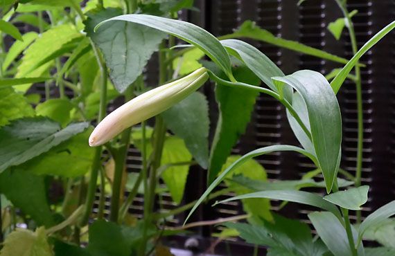 芽出しが始まってもいい時期になっても一向にその兆しを見せず、今回も枯れてしまったか・・・と半ば諦めていたヒメサユリ(姫小百合)でした。季節が進んで、植え付けた場所の周辺の他の品種が我先に伸び始めて、当のヒメサユリを探す努力も放棄していました。 それが昨日になって緑一色だったプチ花壇の一角に、見覚えのある大きな(大人のゴツゴツとした小指ほど)ツボミが存在を主張するかの様に、身を乗り出しているのが目に入りました。微かにピンクを帯びた白いツボミで、紛いもなくヒメサユリのツボミです。初花は1輪のみでスタートし、齢を重ねる毎に2輪、3輪という風に花の数は増えるそうです。1輪だけとは言え、まずはツボミを付けただけでも赤飯ものです。今は周りを大柄なホタルブクロに囲まれて肩身が狭そうですが、これらの半数ほどを邪魔者として駆逐して、新参者優先で日照権問題を改善することにします。