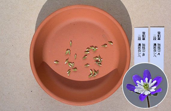 この1週間ほどで何度か取り上げた雪割草のタネ採種の顛末をご紹介。画像は我が家の雪割草保有品の中で、お気に入りのTop3に入る二段咲・濃紫白シベの種子です。朝方見回った際、こぼれ種がポット内に散乱しているのに気付き、早速回収と残品採種を行い、かき集めた約30粒です。これだけあると発芽率が高い場合、種蒔きポット1個では過密となり、成長速度に悪影響を及ぼす恐れがあることから、ポットは2個用意しました。品名ラベルが2個あるのはそのためです。 下画像が植え付けを済ませた様子ですが、各々に15粒程度を蒔いています。早ければ今月末には発芽が始まるかと思いますが、夏場の高温や強い日差しを避けつつ、濃いめの肥料投与で2年後の初花を目指すつもりです。