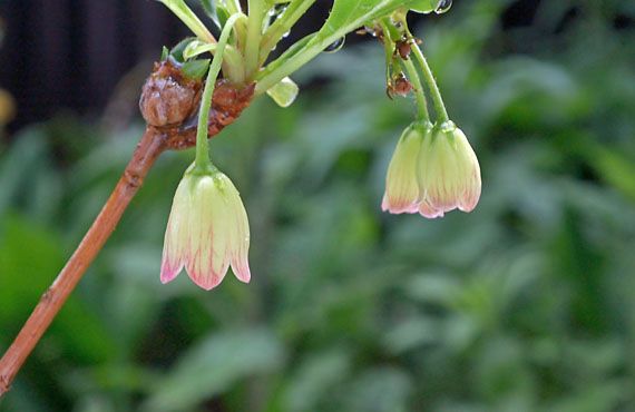 ドウダンツツジ(灯台躑躅)が開花しました。初花なので前年比較はありません。推定樹齢3年、樹高0.4mの若木で、子育て(ツボミ育成)経験不足のため(!?)か、当初10輪ほど付いてツボミが半月ほどの間に次々と立ち枯れて、残ったのはこの3輪だけになってしまいました。山野徘徊の際、自生する個体の花は釣鐘型の花の先端はもっと赤みが強かった様に記憶していますが、この点も樹齢の積み重ねで変化することを信じて待つことにします。 我が家では山野草に重きを置いて品揃えしています。畑違いの樹木を組み入れた理由は、夏の強烈な日差しを遮る日影樹としての役割をして貰うことに加えて、更には春の花に加えて晩秋には紅葉も期待できる、という風に、甚だしく強欲な目的が動機になっています。日影樹としての役割が果たせる様になるには10年ぐらいかかるかもしれませんが、気長に待つことにします。