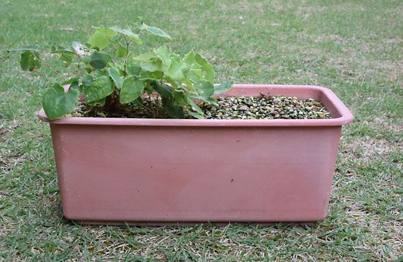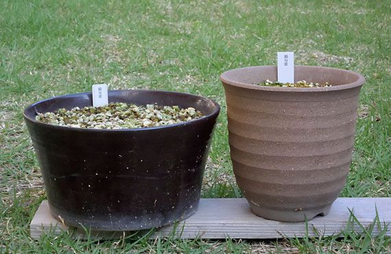 実生1年、正体不明のイカリソウです。他の草花のポットに寄生する様に、こぼれた種子から発芽したものを、このプランタに引越しさせ、見守って来ました。比較的育ちが良かったこの個体、もしかしたらこの春花を咲かせるかと期待していましたが、流石に普通の山野草が1年で花を咲かせることはなく、期待しただけで終わってしまいました。とは言っても、この先大きなアクシデントがなければ、来年の春には確実に花を付ける訳で、その時になって初めてどんな品種か正体が明らかになる筈です。 さて、その正体不明のイカリソウをいつまでも大きなプランタに植えておくわけにもいかず、戸建ての住まい、つまりポットに転居させることにしました。下画像が引越しを済ませた様子で、ポットは左が5号、右が3.5号です。今回の引越しのストレスに梅雨休みの強い日差しと高温が重なると、定着どころか枯死に繋がりかねない、ということで、暫くは屋内の涼しい環境で、根が用土に馴染むのを待つことにします。