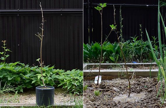 今回はヤマモミジの引越しを紹介します。2017年に入手したもので、現在は3.5号ポットに植えています(画像左)。入手時の樹高は7~8cmでしたが、1年で10~15cm丈が伸びる様子を見ていて、当初の使用目的(盆栽用)を放棄し、日影材に転向してしまいました。推定樹齢4年ほどで樹高50cmほどに育ち、今のポットでは窮屈になってしまい、露地で育てることにしました。 画像右が引越し後の様子です。これまでは小さいポット故の短所、用土の総量が少ないために水切れを起こし易く、主幹の先端が枯れてしまうといったアクシデントが起きていましたが、露地移行でこうしたリスクはなくなる筈です。最終的には樹高1.5mの傘型樹形を目指していますが、数年がかりの大仕事になるかもしれません。