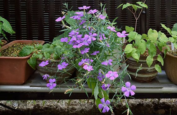 花のボリュームという点で、アムールナデシコがピーク期を迎えました。1番花開花から20日が経過し、ポツリポツリと咲いたものが既に種子に変わり始めました。この状態が1週間ほど続き、その後、花は次第に下火になってしまいます。 これまで花の見せ方として、長く伸びる花茎に緩いタガをはめて上へ上へと伸ばして、頂上部に咲かせることばかり考えて来ました。これが実に厄介な仕事で、何かの拍子タガが崩れてしまうと収拾がつかなくなってしまいます。今の状態(画像)がそれで、今年は形にはこだわらないことにして、放置しています。次のシーズンには一旦20~25cm上に伸ばし、その後は枝垂れ桜の様に、或いは滝の流れの様に垂れ下がる形をイメージしています。上手くいくか、悲惨なことになるか、次のシーズンをお楽しみに・・・・