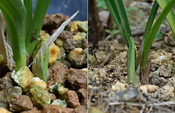 花鉢に水遣りをしていて、シュンランの株元に新子が顔を出しているのに気が付きました(画像左)。身の丈1cmほどの可愛い新顔です。ポットの個体にこうして新子が姿を見せ始めたなら、露地の個体にも変化があって然るべきだろう、ということで、分散して植えているものを点検してみると、ありました(画像右)。こちらは身の丈2cmに伸びており、2~3日先行して顔を出していたのかもしれません。ポット、露地の全点をザっと見て回りましたが、昨日時点で見つかったのはこの2点だけでした。新子の季節は始まったばかりの様子です。 それにつけても、この2年ほどシュンランは作落ちが続いています。原因はよく分かりませんが、何らかのテコ入れが必要になっています。過密、栄養不良、用土疲労、等々、幅広く改善を進めて状況の転換を目指すことにします。
