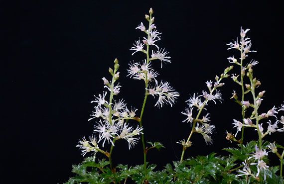 10日前に咲き始めたヤクシマショウマが見頃を迎えました。2鉢に10本の花茎が立ち上がり、いずれも満開期に差し掛かっています。と言いつつ、最初の1輪を咲かせた花軸、画像の右から2番目は花序の先端部まで咲き進み、早く開花した部分は既に萎れてしまいました。ここから先は日毎にこうした萎れが広がり、10日ほどでこの品種のシーズンは幕を閉じることになります。