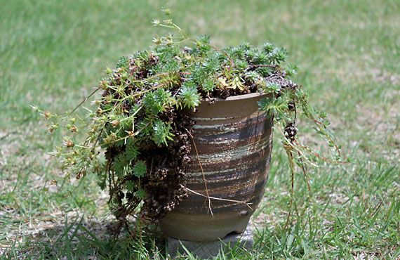 シコタンソウの花期が終って、改めてポットの全体像を眺めてみると、何とまあ見苦しいことか...。茎は毎年5~8cm伸びますが、前年の葉っぱは枯れてしまい、青みが差すのは先端部だけ、ということになってしまいます。上画像は最後の植替えから3年が経過したポットですが、この品種の茎は自立できるだけの強さがないため、地を這うように伸び、ポットの端面に達すると垂れ下がってしまいます。こうした甚だしい見苦しさを解消するには、栽培指南サイトによると「植え替えなさい。適期は花後」ということらしいのですが、手間がかかる割に定着率も期待するほど良くないため、常にポットのどちらかに偏った株の配置になりがちです。 こうした手間と定着失敗のリスクを避けたい、という手抜き老人の本能が先に立って、今年は株元数cmの茎を残し、そこから先は完全に刈り払ってしまいました(下画像)。こうすれば残った茎から上手くいけば新芽が出て、そこから新たな株が再生産される・・・という、確信というより願望が動機の措置でした。ここまでは5月末の話です。 それから1ヶ月近くは何の変化も見られませんでしたが、ここに来てポツポツと新芽が顔を出すのが確認できました。こちらがその様子です。このまま推移してくれたら植替え以外に、剪定でもポットの再生・・・という願望が現実味を帯びて来ます。何とか上手くいけば、手入れの能率はグンと上昇するのですがね~~。