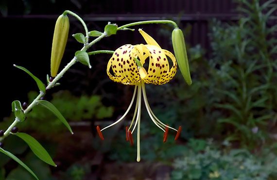 オウゴンオニユリ(黄金鬼百合)が開花しました。昨年より2日早い開花です。今回開花した個体は、主が枯死して空き家となったポットに寄生した株で、主力の露地植えの一群は2~3日遅れて推移しています。この週末には、こうした露地モノも咲き揃うものと思います。 この品種の生命力、繁殖力は脅威すら感じさせます。種子や球根の分裂による増殖が問題になることはありませんが、ムカゴ(画像の葉の付け根に付いた黒い球体)による増殖は爆発的で、4~5年を経過した古参株の場合、1年で数10倍に増えることも十分にあり得ます。このため我が家では、このムカゴが自然落下する前に人為的に採取して、決して地面には落さない努力を続けています。この個体の開花を機に、本年1回目のムカゴ狩りを行いましたが、1回、2回では済まないのが面倒なところです。