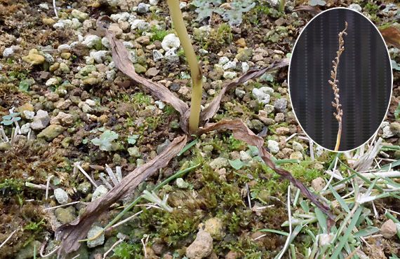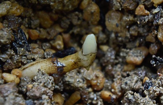 この春、クマガイソウは芽は出しましたが、花を咲かせることはありませんでした。それでも枯死していなかっただけでも良しとして見守ってきたのですが、先月半ばにはその個体も地上部が姿を消してしまいました。これがこの品種としての消滅なのか、それとも暑さに負けて地上部だけが枯れたのか、確認したくなりました。もし前者なら欠員補充の手立てを考えなくてはいけません。 早速この春芽を出した辺りを掘り返しにかかります。万一地中の根茎にスコップが当たっても傷を付けぬ様、静かに優しく掘り進めます。まず2年前に植え付けた深さ5cm辺りまで土壌を排除しても何もありません。ならば・・・ということで更に5cmほど掘り進めるとやっと何かに当たった手応えがありました。これまで以上に慎重に掘っていくと根茎らしきものが現れました。その根茎に沿って更に掘り進めると終端らしい部位に行き着きました。それが上の画像ですが、冬芽らしきものも生成し始めていました。何とか種としての消滅は避けらことを確認して、元通り覆土して作業を終わりました。これが無事に成長して、来春花に再会できればいいのですが ....