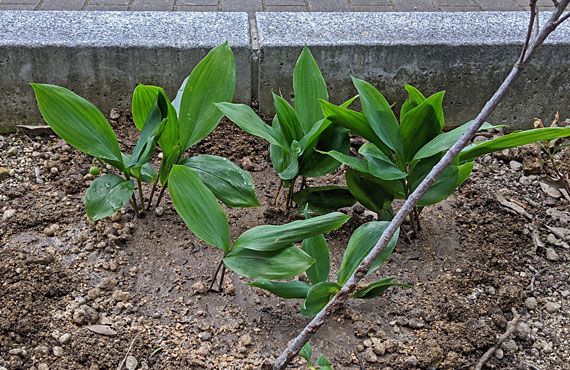 昨日紹介したドイツスズランの里子に関して続報です。市有地の歩道に設えられた小さな花壇には名も知らぬ低木が植えられていますが、土壌に馴染めないのか一向に成長する様子が見られないばかりか、少しずつ枯れて空地(隙間)が目立つ様になって来ました。こうした隙間に、何かの花を植えられないか相談を受け、本件のスズランを提案した結果、即決で植え付けが決まったものです。 場所については明言はしませんが、植え付けを済ませた様子が上の画像です。土壌は砂(真砂土?)が半分以上を占めていそうで、肥料分は殆ど含まれていない印象です。この先定期的に肥料の散布に通う必要がありそうです。