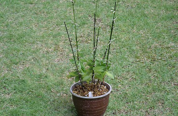 昨日紹介した通り、ハクサンシャジンの花の準備は順調に進んでいます。それに対して、花茎の姿勢は?、というと、一旦株元で放射状に地面に伏せて、その後花の季節が近づくと上向きに方向を変えて伸び始めた結果、全体を見ると甚だしくだらしない姿勢になってしまいました。今回はこのだらけ切った花茎に添え木を当てて、”気をつけっ”の号令で背筋をピンと伸ばして直立している風な、姿勢の矯正をしようというものです。 直立させるのは2.5mm径のアルミ線です。額面通り直立させると、花の時期に天辺が広がりを持った時、相互に干渉し合うことになるので、上部が幾分広がる様に支柱となるアルミ線を用土に差します。曲がり癖のついた花茎を、この支柱に沿わせてゴム引き鉄線を巻いて固定します。花茎6本に対して同様の措置を行って、作業を終了した様子が上の画像です。あと半月余りで花の季節を迎えると思いますが、何とか見苦しいところをご覧頂くことは避けられそうです。
