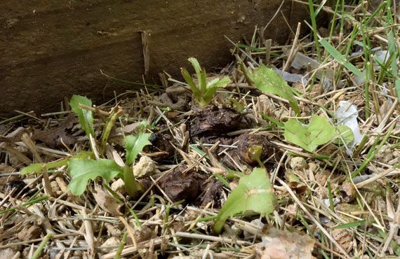 昨日紹介した様な休眠(実は眠ってはいない?)入りするものがある一方で、休眠から覚めるものもあります。それが上画像の白花タンポポです。この品種は5月末頃から1株、また1株と姿を消し6月上旬には全て姿を消していました。それに加えて、雨や暑さで芝刈りも疎遠になってしまい、伸びてしまった芝に隠れて半ばその存在すら意識から消えていました。 久々の程よい暑さの晴れ間に、芝刈りを行っていてポツリポツリと青みが顔を出し始めているのに気が付きました。画像はその芝刈りから2日ほど経った時点で撮影したものです。地表にまでせり上がった塊根の先端部から青葉が顔を出しています。芝刈りの際、新芽の先端をバリカンがけしてしまったため、どれも葉先が欠けています。我が家の最古参株だけあって、塊根も6株ほどに分化していますが、このままだと最盛期の株立ちが大型化し過ぎることから、近いうちに半分程度を間引いて規模の適正化を図るつもりです。