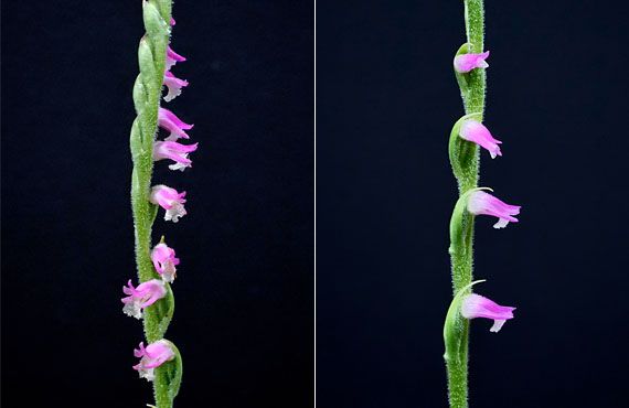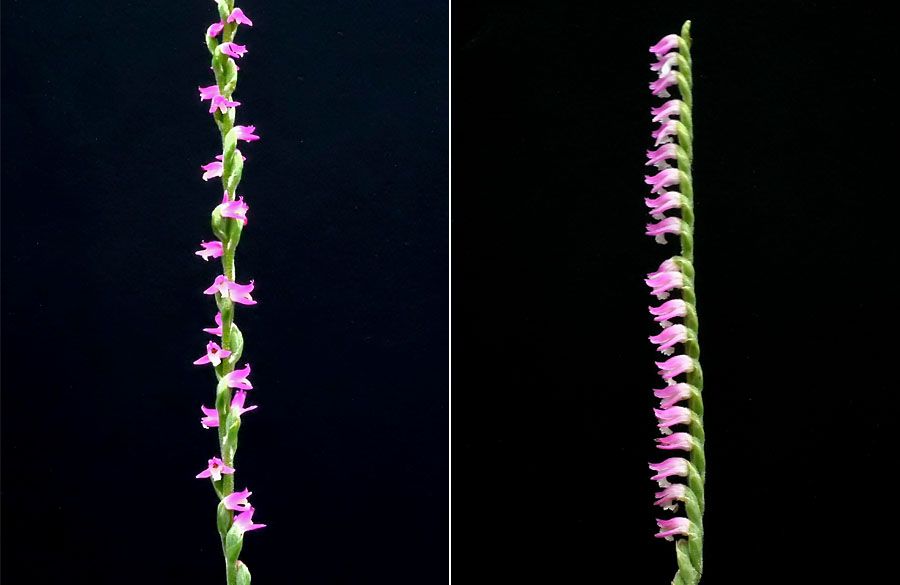 今年、作況が芳しくなかったネジバナでしたが、そうした中でも何とか絵になる出来栄えのものから、今年の働き者と怠け者を選んでみました。 画像の左が働き者で、花4~5輪で花序を1周するほどのキツイ捩じり様です。上から見て時計方向に捩じりながら天辺に向かっており、ネジで言えば「左ネジ」に相当します。ねじりがきつ過ぎて、結果的に捩じっているというより、ただとっ散らかっているだけと見えてしまいます。これが10~15輪で1周するくらいが、連続的に捩じれ感は際立ちます。この花の世界でも「過ぎたるは及ばざるが如し」という故事は成立する様です。因みに、今年は右ネジに当たる個体では、ちょうどいいサンプルは発見できませんでした。 それに対して画像右は怠け者代表で、花序の下端から天辺まで半周どころか1/4周もしていません。これだけ芯の通った怠け振りになると、注意するよりむしろ応援したくなってしまいます。