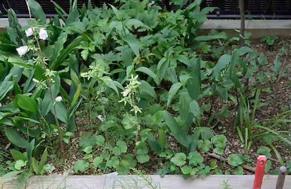 そろそろ梅雨も幕引きか、という時期になって来ました。かねてより案として温めていたプチ花壇の品種間バランスの調整を決行することにしました。調整の骨格は強力な繁殖力で増え過ぎたホタルブクロとドイツスズランを大幅に減らし、これらの繁茂の煽りを受けて劣勢に立つシモツケソウとカキランの失地を回復することが目的です。駆除に伴い、網の目の様に地中に張り巡らせた地下茎を排除する過程で被害者側の根回りには少なからぬダメージが及びます。工事終了後数日の雨があれば、そうしたダメージも幾分か和らぐか、という期待から今決行に移すものです。 梅雨の雨で土壌が柔らかくなっていたため、作業の方は比較的楽に進みました。網目状の根っこの方は・・・というと、ホタルブクロの方は小は糸状の小さいものから、割り箸サイズまで縦横に走り回っていました。もう一方のドイツスズランは大きいところは大人の小指ほどもある根茎(?)が他の品種の根回りだろうとなかろうと、ところ構わず這いまわっています。これを駆除するために、やむを得ず被害側の株を一旦抜き上げざるを得ない場面もあって、結果的に植え替えてしまうものも出てしまいました。下画像がアフター画像ですが、かなりスッキリしたし、空地も捻出できました。 さて、駆除したドイツスズランについては受け入れ希望があり、相当量を里子に受け入れて貰える見通しが立ちました。こちらその候補ですが、今日にも現地に赴き植え付けを済ませるつもりです。