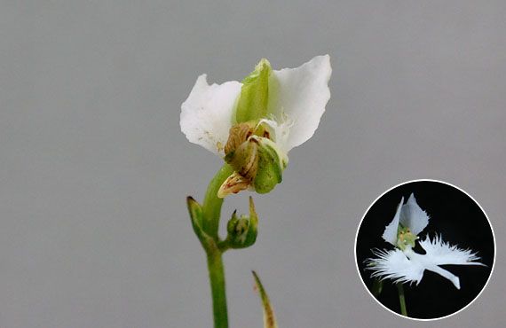 サギソウの「銀河」が開花への歩みを放棄してしまいました。3日ほど前から画像の状態でフリーズしたかの様に動きを止めてしまい、遂に昨日は白い花弁の一部が黄変、つまり腐り始めてしまいました。5年ぶりに自宅で咲くサギソウが見られるか、と意気込んでみたものの何とも儚い夢でした。 長いご無沙汰で、サギソウの詳しい姿・形を忘れかけています。で、5年前(2015年)に咲いた時の画像を引っ張り出してみたのが円内です。これを元に今年の形状を分析してみると、サギの尻尾に当たる部位までは開いていたことになります。良かったのはここまでで、翼、頭、胴体に当たる部分が動きを始めようか、という段階で何かアクシデントが起きた様です。花弁のひだの部分をよくよく眺めるとアブラムシらしきものも見つかりました。これと開花未遂との関連は不明ですが、両者の関連については、文献や指南書閲覧時に手がかりを嗅ぎ出してみようと思います。