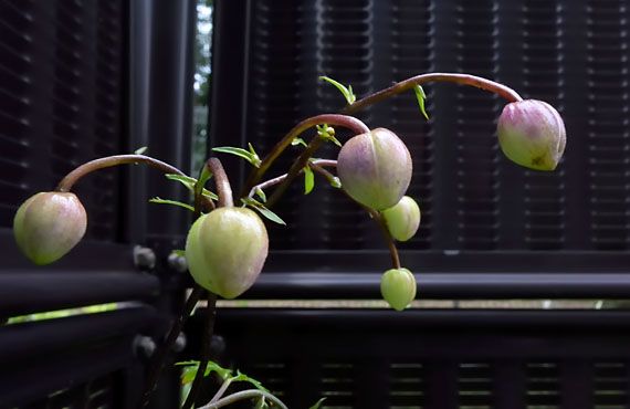 レンゲショウマ(蓮華升麻)のツボミが、大きなもので8~10mmに成長し、外装となる萼片の色は赤紫色を帯びてきました。ここまで大きくなると萼片はかなり固くなるため、滅多なことでは賊どもにも歯が立たず、食害に怯えることもなくなります。 後方に小さく写っている個体は発生が遅れたもので、大きさは4~5mmといったところですが、この段階で賊に襲われると絶好のご馳走になりかねません。昨年はその段階で大発生した賊の襲撃を受け、8割方が賊どもの腹の中に消えてしまい、結果大凶作となってしまいました。今年はまだそうした賊は発生しておらず100%に近い生存率を実現しています。遅れている個体も、あと10日も経てば安全圏に入り、今月下旬から来月上旬の開花時期に滑り込むことができます。今年は「豊作間違いなし」と言っても良さそうです(ニンマリ)。