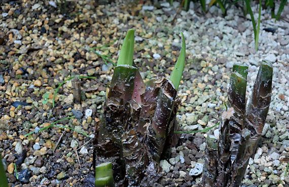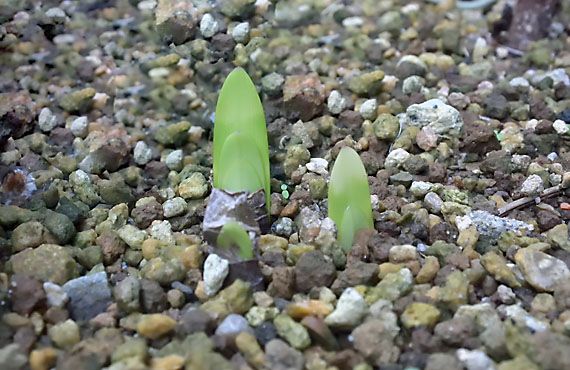 リコリス3品(山の根ゴールド、さつま美人、アルビ・フローラ)が一斉に出葉を始めました。これでまだ開花していない最晩生黄花品以外は全て出葉を確認したことになります。画像は「山の根ゴールド」ですが、花芽1本から3芽の葉が顔を出しました。つまりこの個体は、この1年で3倍に増えたことになります。品種としての増加率は、全個体の出葉が終るまで確かなことは分かりませんが、急ピッチで飽和に近付きつつあるのは間違いありません。遠くない時期に、この子たちの身の振り方を決めてやらなくてはいけません。