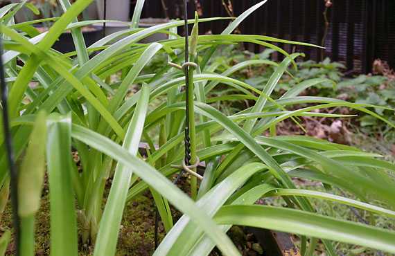 ネリネ・ウンズラータも成長の早いものは丈が20cmに手が届こうか、というサイズになりました。この段階の花軸は自立も怪しまれる様な軟弱さです。成り行き任せにして放置すると、根元付近から次第に硬さを増した際、曲がり癖がそのまま固定され甚だしく姿勢がよろしくない姿となってしまいます。 これを避けるために姿勢矯正用の支柱を立てて、この支柱に添わせて固定するという方法を取っています。昨日は成長が進んだ5点ほどに対して、この支柱を立てました。きつく縛り過ぎると、拘束点より下が伸びた時、逆に異常屈曲を起こすし、弱過ぎるとずり落ちてしまい矯正効果を失ってしまいます。力加減は微妙ですが、開花までの3週間の大事な仕事になります。