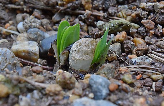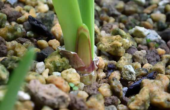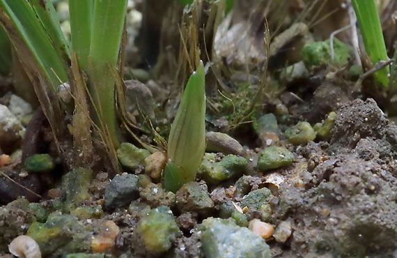 白花リコリス「真夏のクリスマス」が出葉を始めました。在来種のヒガンバナでは、花が満開の頃から出葉を始めたのに対して、こちら「真夏のクリスマス」は律義に花が終って3週間ほど経ってからの開始です。偉いぞ。良く辛抱した。 画像の個体は、今年の花芽1本(中央の半透明の物体)から2芽の葉が顔を出しました。地下ではこの夏の内に球根が分球して2つに分裂していた様です。新たに発生した球根は花を咲かせるだけのスタミナ(=球根サイズ)が整わなかったため、今年は花を咲かせることはできませんでしたが、次のシーズンまでには地力をつけて花を見せてくれる筈です。まだ全てが出葉を始めた訳ではなく全体像は掴めませんが、こうした形でファミリーを増やす者がまだまだありそうです。