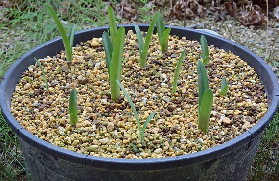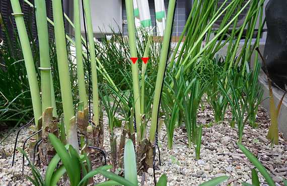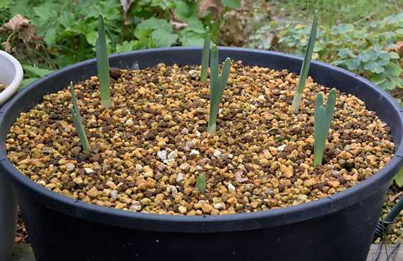 梅雨入りの頃から姿を消していた八重咲スイセンが、暑さの峠越えを察知したのか目覚めの時を迎えました。昨日昼前にポット・プランタを見回ったところ、八重咲スイセンのプランタのあちこちで、用土が1cmほど盛り上がっているのが見つかりました。その盛り上がり部分の用土をどけてみると、スイセンの葉が頭をもたげ始めていました。新年度の幕開け・・・ということになります。 このプランタは初夏の頃(5/中旬)、まだ一部生きていた葉っぱをバッサリ刈込んだ上で、球根7点を植え付けて、夏場を乗り切って来ました。今回の芽出し確認で、初夏の植え替えのストレスを無事に乗り切ったことが確認できました。この先、2ヶ月ほど時間をかけて、葉っぱの充実に全勢力を注ぐことになります。そして早ければ12月初め、遅くとも1月初めには花を咲かせ始め、寒の時期、小庭の賑わいの中核を占めることになります。