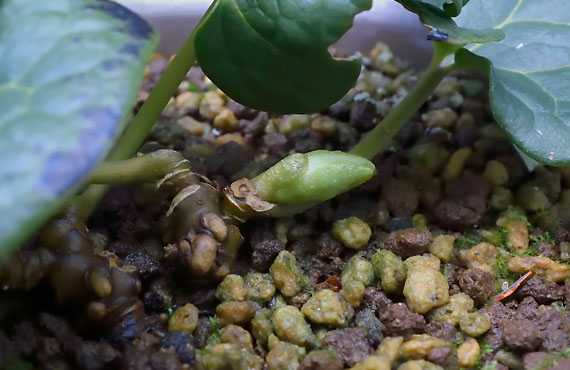 コシノカンアオイ(越ノ寒葵)が来春に向けてのツボミが膨らみを増してきました。今の大きさは太さ5mm、長さ1cmほど、といったところです。このサイズのものが右側の茎に1個、画面外になりますが左の茎にも1個付いています。これが花期の2月中旬までに太さ、長さとも3倍近くまで成長することになります。”花”と言えばヒラヒラとした柔らかいものが浮かびますが、この品種に関しては落花生の殻を思わせる硬さが持ち味です。 思い起こせば今年の春は記録的な豊作でした。左の茎には花は付きませんでしたが、右の茎には6個のツボミが付きました。この個数では度を越える過密は明らかで、”押し競饅頭”状態を避けるために内2個のツボミを間引かざるを得ませんでした。来シーズンは僅か2輪の貧作がほぼ確定で、寂しい春になりそうです。