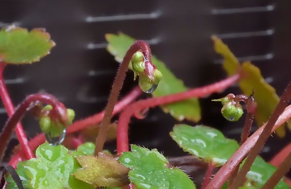 白花ダイモンジソウ(大文字草)が動き始めました。このところ我が家付近が工事の最前線になったこともあって、いつも通りに外に出る訳には行かなくなっています。この花芽も1日前に発見できたかもしれませんが、巡回のタイミングで昨日が初見日ということになってしまいました。台風14号の影響で雨の中での発見となったため、たっぷり水滴を纏っての遭遇になってしまいました。 この品は昨年花も殆ど終わった頃にHCの園芸コーナーで購入したもので、添付画像が山野で見かける自生種と姿形がよく似ていたことから入手を決めたものですが、1年経ってみると葉っぱの様子から自生種を超越しています。せめて花だけは裏切らないことを願うばかりです。結果が出るのはあと1週間から10日といったところでしょうか。