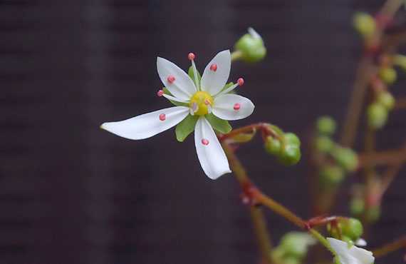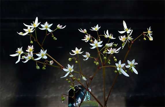 白花ダイモンジソウが開花しました。この品種が我が家にやって来て初めての開花なので、前年比較はできません。 花は?というと、純白の花弁にピンクの花粉がよく映えます。自然界で見かける自生種と比べると、花弁は幾分幅広で短い様に見えます。また花軸もかなり太目で、こうした細かな違いは品種の違いを示すのかもしれません。品種や系統の差異は脇に置いて、この品種が結構気に入ってしまいました。長く付き合って行けそうです。