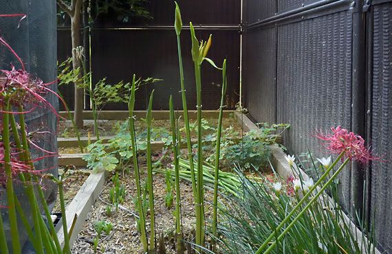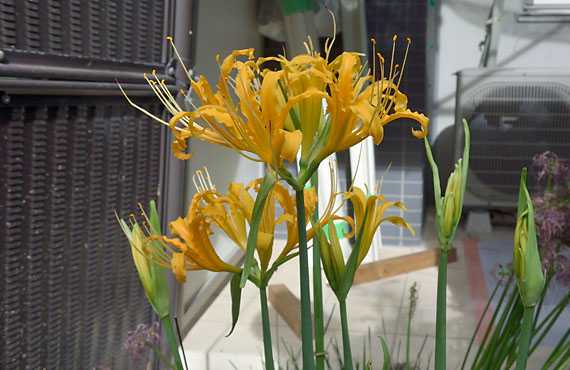 在来種のヒガンバナも一巡して、残る花は僅かになって来ました。この段階に至って、やっと最晩生の品種にスポットが当たる様になります。 最晩生品は黄花で、花の差し渡し径が20cmを超えることもある大型品です。その割に花軸は軟弱で、ツボミの成長に加えて日差しを追う特性が加わって、花軸はくね~と曲がってしまいました、これでは余りに見苦しい、ということで支柱を添えて何とか直立させました。今年は花軸8本で中々の豊作です。あと2日ほどで開花するかと思いますが、何とか背筋ピンの姿勢で開花を迎えられそうです。 それにしても、右のフェンスに見られる様に、降雨時の泥ハネの酷さには困ったものです。通常なら最大でも20cmまでしか泥ハネはありませんが、工事用足場の保護ネットに蓄えた水が10階辺りから落下すると軽く1mほどまで泥まみれになります。これでは花まで泥まみれになりかねません。せめて晴天日を選んで(?)開花して貰いたいものです。