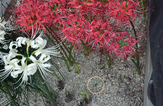 ほぼ満開のヒガンバナを眺めていて、ふと地表に視線を落とした時、早くも出葉が始まっているのが目に飛び込んできました。昨日ネリネを取り上げた際、地方名に「ハミズハナミズ(葉見ず花見ず)」というのがあることも書き添えましたが、この呼び名の由来が次第に影を潜めてしまいそうな気分に陥ってしまいました。 環境のせいか、或いは個体の特性か、正しいところは不明のままですが、我が家で栽培する個体は出葉の時期が比較的早い傾向はありました。そうはいってもこれまでは7~8割の花が寿命を終える頃に葉が出始めるという風に比較的控えめだったのですが、今年は満開の時期から出葉を始めてしまいました。随分あからさまな行為・・・などと言っては、度が過ぎた擬人化と言われそうですが、何はともあれ、伝説とか言い伝えの様なものは、事実の積み重ねにより少しずつ崩れていくのが避けられない様です。