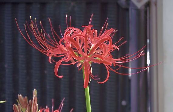 赤花のヒガンバナがほぼ八分咲きまで咲き進んできました。昨年はこの段階で、相方として公認している白花品も同レベルの開花状況だったため、中々の見応えがありました。1年後の開花状況は・・・というと、相方白花品の開花が9日も先行したため、現在咲き残っている白花品は3本だけです。うち1本はかなり離れた位置なので、1枚の画像に収まるのは2本だけです。何とも寂しく、華やぎに欠ける景観です。 加えて修繕工事の足場と保護ネット(右半分の黒い壁)に囲まれて、カメラアングルにも大きな制約が付いて回ります。春、暖かくなる頃には工事は終了しますが、それまではこの不自由さを我慢しなくてはいけません。そろそろ秋の植替えに取り掛からなくてはいけませんが、段取りを考えるだけでも、気力が萎えそうです。