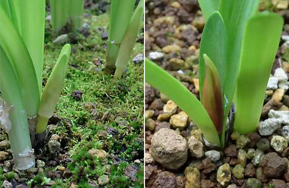 ネリネ2品が順調に生育中です。成長の早いものは、花軸の丈が10cmに近付いています。左がウンズラータ、右がウンズラータ・「Rosea」です。この状態から開花までは、ザクッと言って3週間ほどです。この流れを今年のカレンダーに当てはめれば、11月第3週の前半頃になりそうですが、さて、当たるかどうか ....。 これまで10年近く栽培して来て、画像右の「Rosea」は葉っぱの中心部から芽を出しているのに対して、左の銘なしウンズラータは葉っぱの集合体の外から芽を出しています。チコちゃんに「ボーっと生きてるんじゃねーよ」と叱られそうですが、今頃になって初めてこの違いに気が付きました。いやはや、何ともお恥ずかしい話ではあります。「Rosea」の芽の出方は親類に当たるリコリスと共通した芽の出方ですが、銘なしウンズラータでは葉っぱと花芽の出方がどうなっているのか、一度掘り返して覗いてみたいものです。