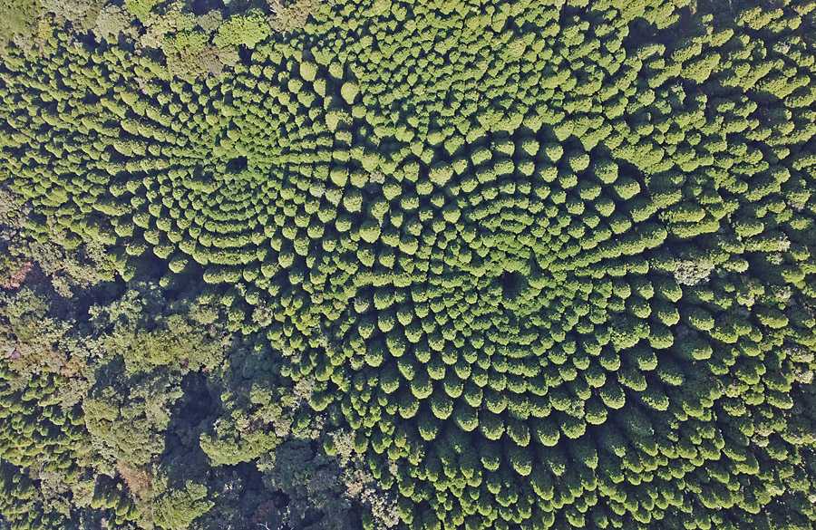 13日から15日にかけて先般訪れた宮崎県の通称「森のミステリーサークル」に再度出掛けていました。僅か3週間での再訪となったのは、①先般の訪問では事実上の撮影失敗に終わったことにリベンジを果たすため、②この期間理想的な気圧配置で、好天が予想されたこと、などから「行くべ」となった次第です。 前回は画像撮影で2つあるサークルの内、片方しか十分に捉えられませんでしたが、今回は一応1枚の画像内に捉えました。ただ、上空の風が強く最大200m程度までしか上昇できず、サークル自体の標高に40mほどの違いがあって、標高の高い方(右)のサークルが極端に大きく写り込んでしまいました。実際は両者共直径は75mほど(航空写真実測)ですが、ドローンの超広角レンズではこんなことになってしまいます。 この日の風は、午前中には完全無風だったものが、12時頃には森の底では何も感じなかったのですが、上空はかなりの強風だった様で、ホームポジションへの自動帰還ができなくなる状態でした。こんな状態で更に高高度に上げると、電池の容量の範囲で回収すらできなくなりそうで、無理はできませんでした。この点への対策は、風の弱まる季節を選んで再々挑戦するしかなさそうです。