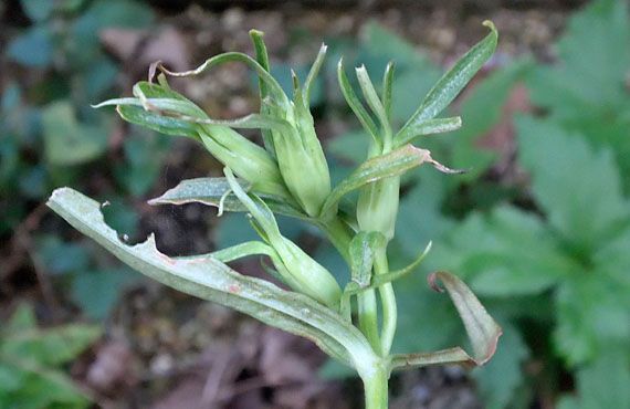 この子のルーツを遡っていくと、高知県中西部の中山間地に辿り着きます。そこで平穏に過ごしていたものを、1株掘り上げて連れ帰ったものが代を重ねてこの個体に繋がりました。ご当地では早いものはお盆の頃から咲き始め、花期はもう終わったのではないかと思います。移転先の気候が気に入ったか入らなかったのか、1ヶ月以上花期が遅れる様になってしまいました。花弁はまだ萼片の中に納まったままですが、この萼片の深さの2倍ほどに育てば、開花が近いことを知らせる合図になります。 それはそれとして、今年も派手に賊どもに食われてしまいました。この時期に見かける賊どもを列挙すると、イナゴ、バッタ、コウロギ、キリギリス、ウマオイなどに、四季を通じて見かけるダンゴムシ、ナメクジなどが加わり、葉やツボミの新しくて柔らかい組織は波状攻撃を浴びています。後方にボケボケで写っているシモツケソウなどは、芽吹きから既に半年ほどが経過していて、固くて旨くないのがバレたのか被害の片鱗すら見られません。