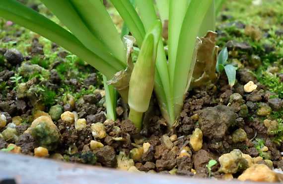 ネリネ・ウンズラータの「Rosea」の新葉が出揃いました。新年度の開幕です。このプランタは、梅雨のさ中には葉を枯らせて更地の様になっていましたが、時が満ちて「ぼちぼち行こか」とでもいう様に、腰を上げた印象です。1~2ヶ月ほどかけて葉を充実させ、早ければ11月の初め頃、遅くとも12月には咲き始めます。気温が低下する時期の開花なので、花の寿命は激長で2ヶ月近く堪能することができます。 この花は分類上はリコリスの仲間(ヒガンバナ科)とされています。ヒガンバナ属が花の時期には葉がなく、花が終ってから出葉が始まるという咲き方を捉えて、ハミズハナミズ(葉見ず花見ず)という地方名も存在するのに対して、こちらネリネは葉も花もお揃いで花の時期を過ごす、という風に大きく性格は異なります。共通点としては、どちらも種子を実らせることがない、という点でしょうか。